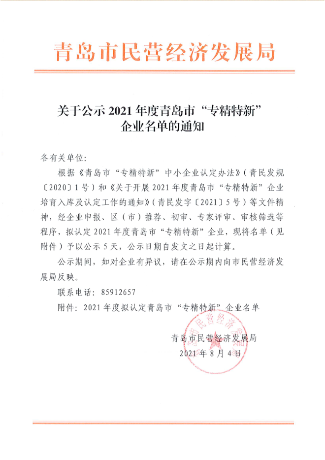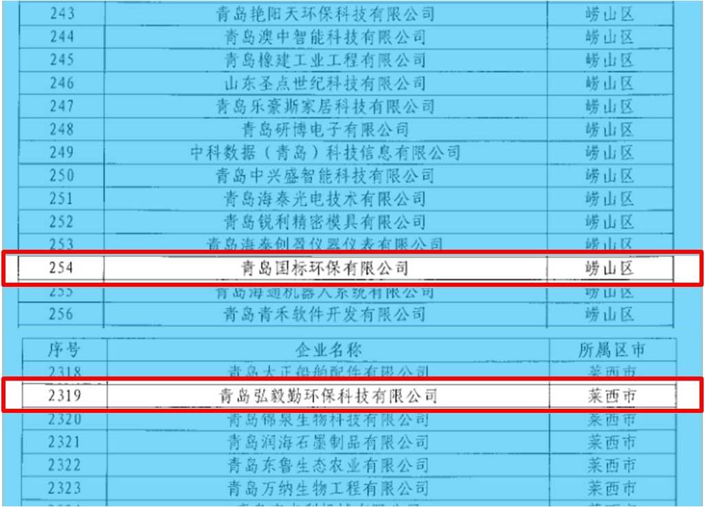 根據(jù)《青島市“專精特新”中小企業(yè)認定辦法》(青民發(fā)規(guī)【2020】1號)和《關于開展2021年度青島市“專精特新”企業(yè)培育入庫及認定工作的通知》(青民發(fā)字【2021】5號)等文件精神,經(jīng)企業(yè)申報、區(qū)(市)推薦、初審、專家評審、審核篩選等程序,青島國標環(huán)保有限公司和國標子公司-青島弘毅勤環(huán)??萍加邢薰就瑫r被認定2021年度青島市“專精特新企業(yè)”。