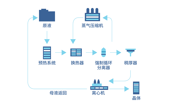 MVR原理是利用蒸汽壓縮機壓縮蒸發(fā)產生的二次蒸汽,提高二次蒸汽熱量和溫度,壓縮后的蒸汽打入蒸發(fā)器作為熱源,再次使其原液產生蒸發(fā),從而達到不需要外部鮮蒸汽,依靠蒸發(fā)器系統(tǒng)自循環(huán)來達到蒸發(fā)濃縮的目的。比傳統(tǒng)蒸發(fā)器節(jié)省70%左右的能源,節(jié)省80%以上的冷凝水,減少50%以上的占地面積。