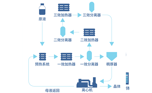 在多效蒸發(fā)裝置中,由新蒸汽加熱第一效產生的蒸汽作為第二效的加熱介質得以再次利用。這樣可以將新蒸汽消耗有效降低約50%。重復利用此原理,可進一步降低新蒸汽消耗。最后一效的二次蒸汽進入冷凝器,用水冷卻冷凝成水而移除。